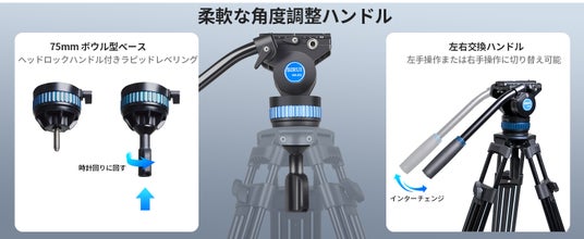 【プロフェッショナルビデオ雲台】ダイナミックバランシングシステムにより、水平360°、垂直方向に-75°〜+90°の無段階移動が可能です。下部のリングは張力の量を調整できるため、頑丈な三脚が左から右にパンして、録音中のスムーズで安定した動きを実現します。