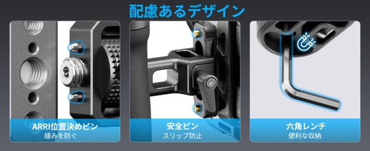 【デザインレイアウト】サイドハンドルには、多数の実用的な拡張ポートが組み込まれています。両側にはリストストラップの穴があり、上部には3/8"-16 ARRI位置決めネジ穴、1/4"-20ネジ穴、およびコールドシューが装備されています。これらのポートにより、必要に応じて機器をさらに拡張することができます。磁気六角レンチが付属しています。