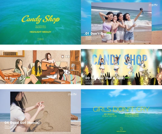 キャンディーショップ(Candy Shop・ソラム、スイ、サラン、ジュリア)が新しい音源の一部を公開し、カムバックに対する士気を高めた。所属事務所Braveエンターテインメントは、5日午前0時、公式YouTubeとSNSに 2ndミニアルバム『Girls Don’t Cry』に収録された曲のハイライトメドレー映像を掲載した。映像には、新しく収録された4曲のハイライト音源をはじめとし、清々しさが溢れるシーンを公開した。キャンディーショップの2枚目ミニアルバム『Girls Don’t Cry』は、ダブルタイトル曲『Don’t Cry』、『Tumbler (Hot & Cold)』で一皮剥けた音楽面の才能を垣間見ることができる。他にもキャンディーショップのユニークで躍動感あふれる魅力が引き立っている『Welcome To My World』、デビュー曲の「Good Girl」を新しく編曲した『Good Girl (Remix)』の計4曲が収録され、キャンディーショップの異彩な魅力を十分に堪能することができる。1つ目のタイトル曲『Don’t Cry』は、大変な状況下にいる子たちに癒しと勇気を与える暖かいメッセージが込められている。困難を乗り越えて、一緒に旅路を歩んでゆく友情の大切さを強調し、キャンディーショップならではの煌めく夏の日に期待を抱かせる。もう一つのタイトル曲『Tumbler (Hot & Cold)』は、エレキギターのワウペダルのアナログ的な感性と爽快なシンセサイザーの音が合わさったポップジャンルの曲として、愛に対する情熱と不安定な感情がテーマとなっている。これは、キャンディーショップの新しい音楽スタイルを感じる曲として、グループの潜在能力を垣間見ることができるものとなっている。一方で、一皮剥けて成長した音楽面の才能を裏づけるキャンディーショップ2ndミニアルバム『Girls Don’t Cry』は、今月12日午後6時に正式発売を予定しており、これに先立ち今月の7日に、タイトル曲『Don’t Cry』のミュージックビデオを先行公開する予定だ。