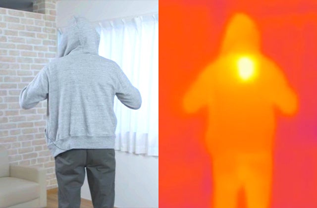 WEARHACKは電源を入れると内蔵の電熱線がすぐに熱を放出。リモコンの電源をONにして10秒後にはじんわり温まり、取り付け箇所から暖かさが広がります。背中の肩甲骨周りを覆うように設計しているので、取り付けた場所から暖かさが広がります。