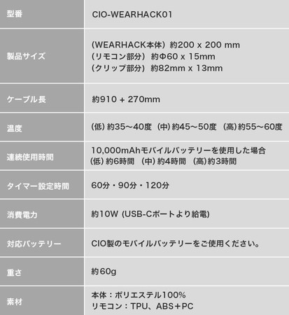 電熱ベストは色々あるけどコーディネートを選ぶ、もしくは持っていないし、かといってカイロを毎回貼ったりとったりが大変。通勤時や買い物、アウトドア・寒い室内で「ちょっと暖かくしたいなあ」というご経験ありませんか?CIOはお気に入りのアウターへ簡単に取り付け、気軽に暖かくできるヒーターパッド『WEARHACK(ウェアハック)』を開発しました。