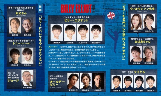 ビリーを演じるのは、厳しいオーディションを勝ち抜き1375人の中から選ばれた、浅田良舞、石黒瑛土、井上宇一郎、春山嘉夢一の4人。主人公ビリー・エリオットのお父さん役には、益岡 徹と鶴見辰吾。ビリーにバレエを教えるウィルキンソン先生役には、安蘭けいと濱田めぐみ。さらに、根岸季衣、阿知波悟美、西川大貴、吉田広大、芋洗坂係長、永野亮比己、厚地康雄、山科諒馬と豪華実力派キャストが結集。