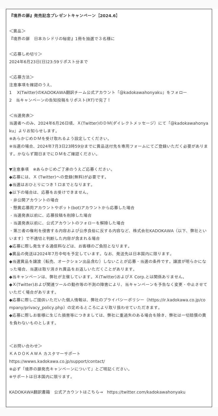 株式会社KADOKAWAは2024年6月13日、エラリー・クイーン傑作ミステリー『境界の扉 日本カシドリの秘密』の発売を記念して、抽選で3名様に本書が当たるプレゼントキャンペーンを実施します。