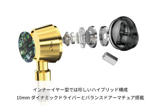 秋 -Aki- インナーイヤー型ハイブリッドイヤホンは音楽の美を追求し、10mmのダイナミックドライバーとバランスドアーマチュアドライバーを組み合わせ、低音と中高音のバランスを最適化しています。素材には銅と光の加減で輝く貝を使用し、洗練されたデザインと音楽の融合を実現しました。