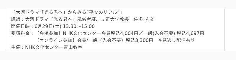 【NHKカルチャー】大河ドラマ「光る君へ」風俗考証の佐多芳彦さんの特別講座6月29日開催!