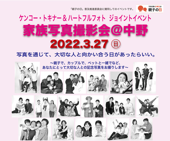 株式会社ケンコー・トキナー(本社:東京都中野区、代表取締役社長:山中 徹)は、家族の絆をテーマに結婚、子ども誕生、親子の写真の撮影を行っている「Heartful Photo」による「家族写真撮影会」を開催。開催日時は2022年3月27日(日)。ケンコー・トキナーサービスショップ内撮影スタジオ(東京都中野区中野5-68-10)にて実施いたします。 参加費は5,000円、先着15組までを募集します。