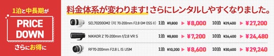 カメラ・レンズのレンタル商品価格を改定。1泊利用がしやすく、中長期利用でさらにお得に!