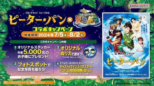 株式会社バンダイナムコアミューズメントは、「屋内・冒険の島 ドコドコ」(東京都立川市)にて、「ブロードウェイミュージカル『ピーター・パン』×屋内・冒険の島 ドコドコ コラボキャンペーン」を7月5日(金)〜8月2日(金)に開催します。