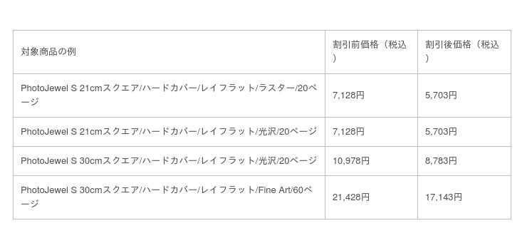 内容:PhotoJewel Sのレイフラット商品(全60種)を20%OFFでご購入できるクーポンをご利用いただけます。