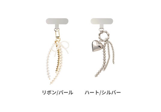 チャームストラップは、スマホにぶら下げればアクセントになり、バックチャームとしても使えるアイテムです。ゴールドとホワイトで大人っぽいデザインの「リボン/パール」と、大きなハートが印象的な「ハート/シルバー」を展開します。