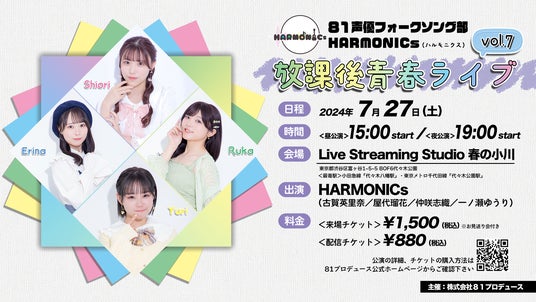 「声優×フォークソング」をコンセプトに活動している 81声優フォークソング部「HARMONICs(ハルモニクス)」のライブイベント『放課後青春ライブ vol.7』が7/27(土)開催!生配信も実施!