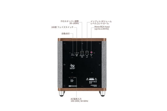 ・調整機能:クロスオーバー調整(50-180Hz)、インプット/ボリュームレベルコントロール、180度フェイズスイッチ