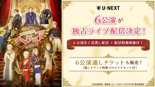 USEN&U-NEXT GROUPの株式会社U-NEXT(本社:東京都品川区、代表取締役社長:堤 天心)が運営する動画配信サービス「U-NEXT」は、2024年8月9日(金)より開催されるミュージカル「ヘタリア〜The glorious world〜」を独占でライブ配信いたします。ライブ配信の対象となるのは、京都の8月11日(日・祝)18:00/8月12日(月・祝)13:00<京都千秋楽>、大阪の8月18日(日)12:30/8月19日(月)13:00<大阪千秋楽>、東京の9月7日(土)18:00/9月8日(日)13:00<大千秋楽>の6公演です。また前回に引き続き、6公演通しチケットも販売予定です。
