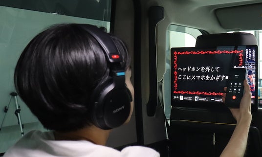 松竹映像センターが新たに独自開発した、音声空間キャプチャーシステム『Audio³ (オーディオキューブ)』を世界で初めてタクシーに採用し、音声×映像の相乗効果により、没入感のあるホラー体験が実現しました。車内に設置されたヘッドフォンを装着し、タクシーの移動時間に「何かが聴こえる...?!」没入型の体験をお楽しみいただけます。タクシーサイネージメディア「GROWTH」には音声と連携した情報を表示するほか、タブレット画面にスマートフォンをかざすと、タクシー限定の映像がスマホに映し出される不思議な仕掛けもご用意しています。