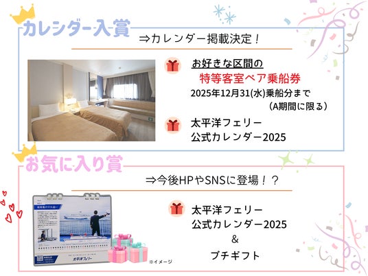 - 賞品:カレンダー入賞…お好きな区間の「特等客室ペア乗船券(A期間に限る)」、太平洋フェリー公式カレンダー2025 お気に入り賞…太平洋フェリー公式カレンダー2025、プチギフト(太平洋フェリーオリジナルグッズ)