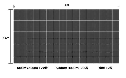 500mx500m パネル72枚。500mx1000m パネル36枚。備用は1枚ずつあります。最大361インチの画面を作れます。
