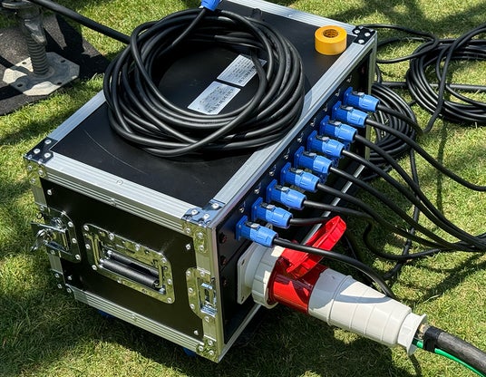 専用分電装置屋外用防水分電装置は400Vから12回路200V分電できる、各回路は漏電保護がある。
