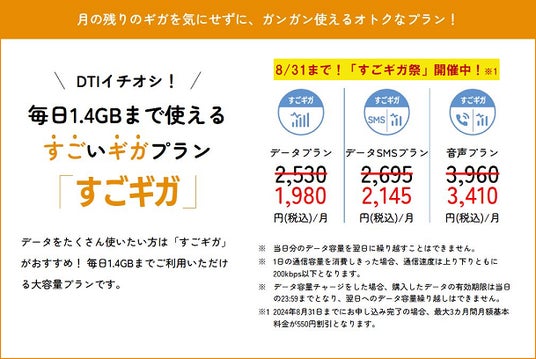 株式会社ドリーム・トレイン・インターネット(本社:東京都渋谷区、代表取締役社長:清水高、以下「DTI」)は、格安SIMサービス「DTI SIM」において、2024年7月18日(木)より「すごギガ祭-2024-」と題し、毎日1.4GBまで使える(※1)プラン「すごギガ」の全プラン(データ、データSMS、音声)の月額基本料金が最大3カ月間550円(税込)割引となるキャンペーンを実施します。