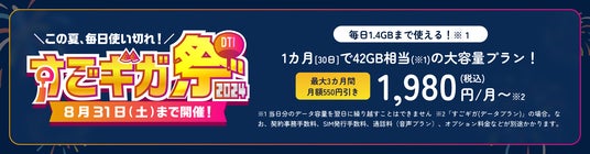 夏休み、パリ五輪などのイベントを迎え、スマートフォンでの動画コンテンツの視聴などにより通信量が増加する時期にあわせ、DTI SIMでは毎日1.4GBまで、1ヵ月(30日)で42GB相当(※1)利用できる大容量プラン「すごギガ」を最大3カ月間、月額基本料金1,980円(税込)(※2)から利用できる「すごギガ祭-2024-」を実施し、ユーザーの利便性を高める通信環境の提供、また市場の活性化を図ります。