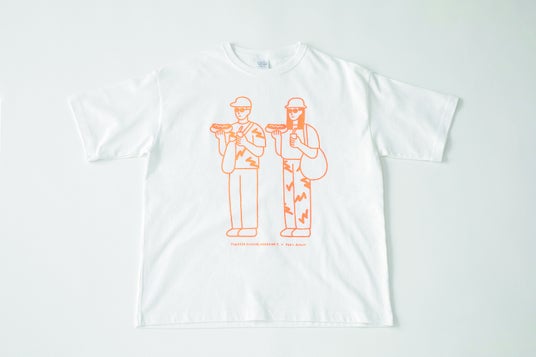 イラストレーター・朝野ペコが描き下ろしたTシャツには、“夏と映画館”をテーマに、映画を楽しみにしている、ホットドッグとドリンクを持った男女が胸からウエストにかけて描かれている。