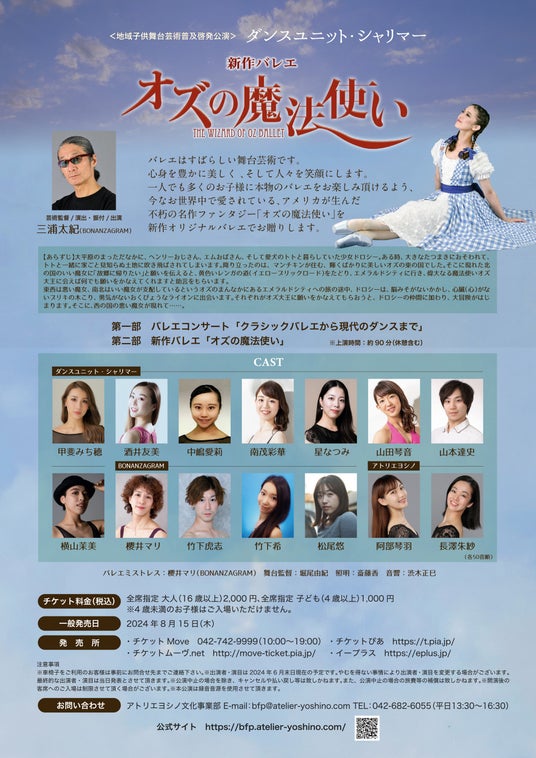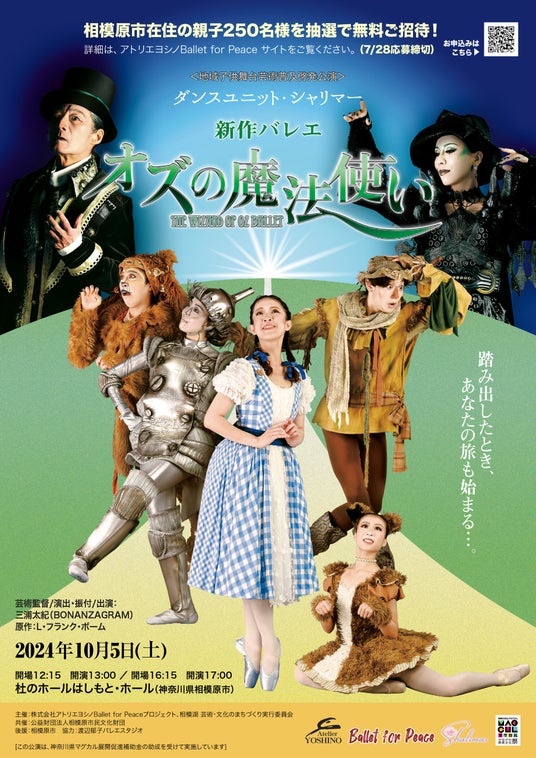 バレエをはじめとするステージ衣装のレンタル会社である株式会社アトリエヨシノ(代表取締役:吉野勝恵、本社:神奈川県相模原市)と「相模湖 芸術・文化のまちづくり実行委員会」では、2024年10月5日(土)、杜のホールはしもと(共催)にて、<地域子供舞台芸術普及啓発公演>ダンスユニット・シャリマー 新作バレエ「オズの魔法使い」を開催します。
