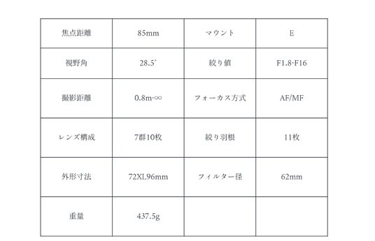 「7Artisans AF 85mm F1.8」レンズ仕様