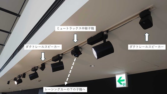 レーシングカーの下の子機は親機からの電波が届きにくい場所にあったため、天井の照明用ダクトレールに設置した中継子機経由で接続しています。ミュートラックスの中継子機を使用することで、現場に合わせた電波のルーティングが可能になります。