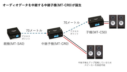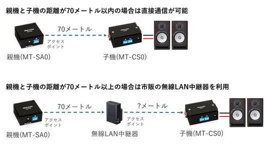 ミュートラックスは1台の親機(MT-SA0)と複数台の子機(MT-CS0)を無線LANで接続し、オーディオデータを送受信するシステムです。親機が無線LANのアクセスポイント機能を持っており、子機がそのアクセスポイントに直接接続してオーディオデータを受け取ります。親機と子機の通信可能距離は約70メートルとなっており、それよりも遠い場所にある子機にデータを送る場合は別途市販の無線LAN中継器を使う事を推奨して参りました。
