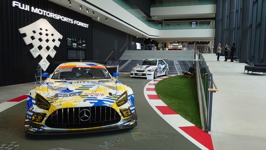 この仕様を盛り込んだネットワークオーディオシステムを、富士スピードウェイに新たにオープンした施設「FUJI MOTORSPORTS FOREST」のウェルカムセンターに初導入いたしました。写真右手のスロープに等間隔で8台、天井の照明用ダクトレールに16台、さらには展示されているレーシングカーの下にもスピーカーを設置し、スピーカーの総数は35台となりました。