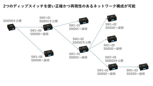 中継子機は2つのディップスイッチを搭載しています。1つ目のディップスイッチで接続するSSIDを、2つ目のディップスイッチで公開するSSIDを指定します。これにより設置現場に合わせたネットワーク構成を正確に指定する事が可能になります。