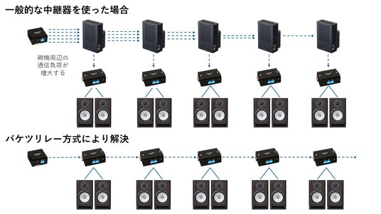 一般的な中継器を使った場合、子機の台数が増えるとともに親機周辺の通信負荷が増大するため、接続できる子機の台数には上限がありました。今回開発した中継子機は、親機から受け取ったオーディオデータを複製し、後段の子機群に渡します。この方式により、後段の子機の台数が増えても親機周辺の通信負荷が増えることがなく、事実上無限に子機を増やすことが可能になりました。もちろん、オーディオデータはデジタルデータとして複製しますので、子機の台数や段数が増えても音質のロスは一切ありません。