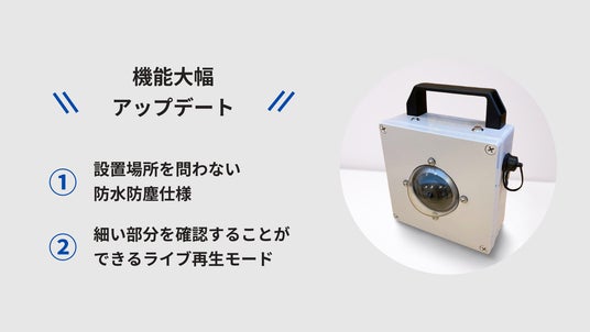 アップデートの一つ目は、防水防塵対応によって屋外にも設置できるようになったことです。従来は、バッテリーがケースの外にあったため、主に屋内工事での利用に限定されていました。しかし、お客様から「屋外でも利用したい」というご要望を多数いただき、バッテリーをケース内に納めることで、屋外現場でも利用ができる防水防塵仕様にアップデートしました。