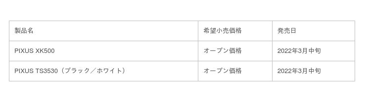 キヤノンは、家庭用インクジェットプリンター「PIXUS(ピクサス)」シリーズの新製品として、写真印刷に適したUI(ユーザーインターフェース)を搭載し、高画質写真プリントと低ランニングコストを両立したプレミアムハイスペックモデル“XK500”と低価格シンプルモデル“TS3530”のインクジェット複合機2機種を、2022年3月中旬に発売します。
