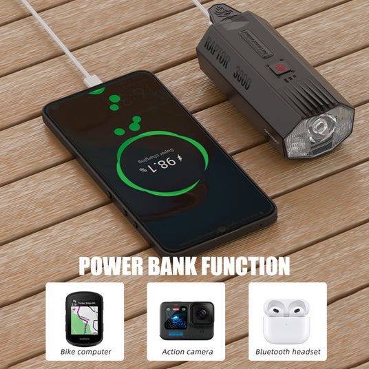 - モバイルバッテリー機能搭載で点灯時もスマホやサイコンの充電が同時に可能