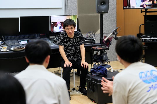 講義では渡邊氏がフォーリーを担当した短編アニメーション『旅はに』を題材に、学生がフォーリーを実践。「口の中が広い人の方が良い咀嚼音がする」「カメラの引き、寄りも考えて音に強弱を付ける必要がある」「駆け足のシーンでは、実際に歩くときのようにかかとから地面に着けると目的の音にならないので、あえてつま先で歩くことで表現する」など実践的で具体的なアドバイスのもと、アニメーションに合わせて制作・録音が行われました。