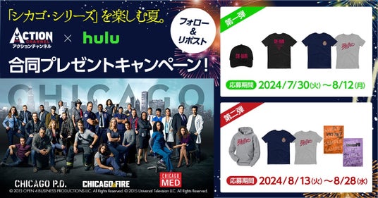 日本唯一の(*1)アクション海外ドラマ専門チャンネル「アクションチャンネル」(旧AXN)(AXN株式会社、本社:東京都渋谷区、代表取締役社長 大園天樹)と、HJホールディングス株式会社(本社:東京都港区、代表取締役社長 高谷 和男、以下Hulu)は、全米大ヒット中の海外ドラマ「シカゴ・シリーズ」の特設サイトを本日より公開します。特設サイトでは、「シカゴ・シリーズ」を毎シーズンご覧いただいている方はもちろん、最新シーズンに追いついていない方や、まだ一度も「シカゴ・シリーズ」に触れたことのない方にも興味を持っていただけるような様々な情報を多数掲載しています。また、シリーズをより楽しんでいただけるようなコンテンツを段階的に公開予定ですのでご期待ください。特設サイトの公開に合わせ、抽選で豪華賞品が当たるプレゼントキャンペーンを実施しますので、この機会に是非WEBサイトをチェックし、アクションチャンネルとHuluで、「シカゴ・シリーズ」をお楽しみください。