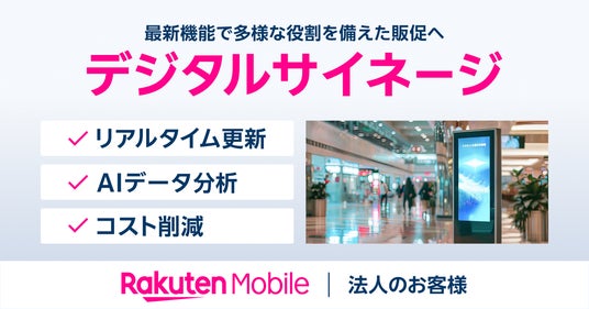 楽天モバイル株式会社は、本日7月31日(水)から、法人のお客様向けに、インターネット回線を利用することでコンテンツの自動アップデート、AIやセンサーによる近隣環境の把握と分析ができるデジタルサイネージ(以下「本サービス」)の提供を開始しました(注1)。