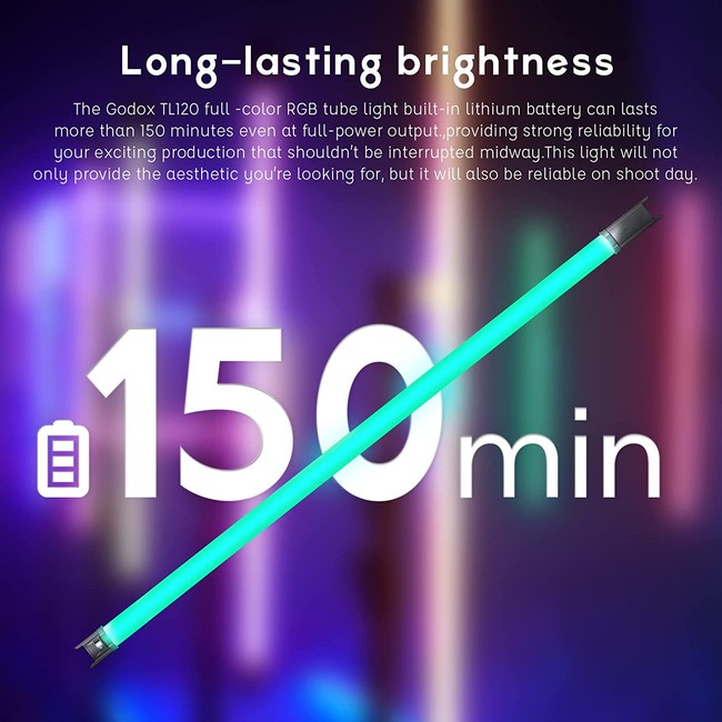 【長持ちする明るさ】Godox TL120フルカラーRGBチューブライト内蔵リチウム電池は、フルパワー出力でも150分以上持続し、途中で中断されないエキサイティングな生産に強力な信頼性を提供します。このライトは、求める美観を実現するだけでなく、撮影当日の信頼性にもつながるでしょう。