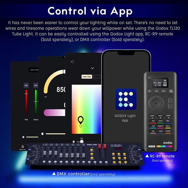 【アプリでコントロール】撮影中にライティングをコントロールすることが、かつてないほど簡単になりました。Godox TL120 チューブライトを使用している間、配線や面倒な操作であなたの意志をすり減らす必要はないのです。Godox Lightアプリ、RC-R9リモート(別売)、DMXコントローラー(別売)を使って簡単にコントロールすることができます。