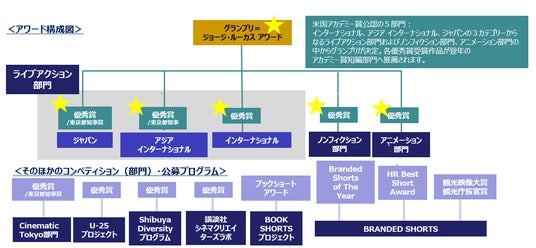 優秀賞が翌年のアカデミー賞短編部門に推薦されるライブアクション部門、ノンフィクション部門、アニメーション部門のほか、東京をテーマにしたCinematic Tokyo部門や国内在住の25歳以下の若手クリエイターを対象とするU-25部門、企業・自治体のブランデッドムービーにフォーカスするBRANDED SHORTSなど多岐にわたるカテゴリーで国内外からの作品を募集いたします。