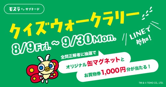 テレビ東京系列「おはスタ」内で放送中のアニメ『ちびゴジラの逆襲』に登場する、“ちびモスラ“をはじめとしたちび怪獣たちのパネルを館内各所に掲出。そのパネルのヒントをもとに、LINEを使ってクイズを進めるウォークラリーを開催します。全3問に正解した方にはオリジナル壁紙を進呈。さらに抽選で100名様に、サブナードお買物券1,000円分と限定缶マグネットをプレゼントします。