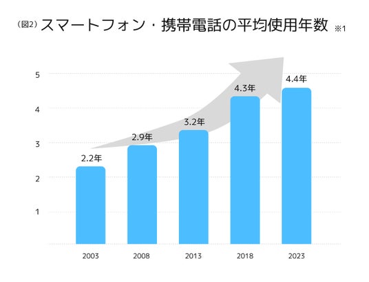 また、端末の平均使用年数は10年前には平均3.2年でしたが、直近では平均4.4年と1年以上も延びています(図2)。この傾向は、「壊れたらすぐに新しい端末を購入する」という考え方から、「壊れたら端末を修理して長く使用する」という新しい考え方へと、スマートフォンの利用方法に変化が生じてきていることを示していると考えられます。