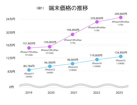 スマートフォンの性能向上や、円安等の影響を受け、端末価格は年々高額化しています(図1)。iPhoneの最新機種の最上位モデル(iPhone15 ProMax)では、端末価格が20万円を超えるケースもあり、我々の生活必需品となったスマートフォンが与える家計への負担は小さくありません。