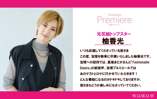 その柚香光が退団後、初めてWOWOWに登場。「宝塚プルミエール」では柚香光退団スペシャルと題し、ロケ企画に挑戦。ロケの詳細、そして柚香光と一緒にロケを行う出演者は後日発表するので、ぜひお楽しみに。「宝塚への招待」では、2022年に上演の花組「Fashionable Empire」を柚香光、そして柚香と共に美しい歌声で多くの観客を魅了した、元花組トップ娘役・星風まどかとの副音声解説付きでお届けする。当時の裏話や思い出話など、ここでしか聞くことができない貴重なトークとなること間違いなし。ぜひお見逃しなく!