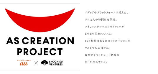 KDDI株式会社(本社:東京都千代田区、代表取締役社長 CEO:高橋誠、以下 KDDI)は2024年8月6日、松竹グループのコーポレート・ベンチャー・キャピタル(CVC)である松竹ベンチャーズ株式会社(本社:東京都中央区、代表取締役社長:井上貴弘、以下 松竹ベンチャーズ)とともに、ショート動画製作を支援するプロジェクト「AS CREATION PROJECT(アスクリエイションプロジェクト)」を開始したことをお知らせします。