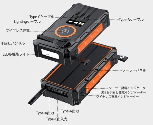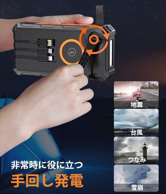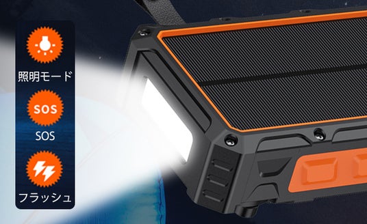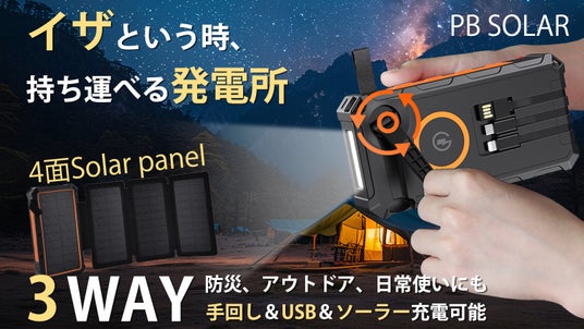 地震、台風、豪雨など緊急事態に備えて開発されたのが、ソーラー発電、手回し発電、SOS電灯モード機能を搭載した「ソーラーモバイルバッテリーPB SOLAR」です。さらに、20000mAhの大容量が持ち、防水・防塵・耐衝撃性もあり、通常使用はもちろん、災害時のいざという時にも役立ちます。