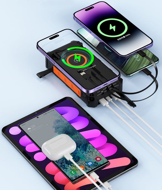 PB SOALRは、3種類のUSBケーブルを内蔵し、さらにType-Aポートが2つ、Type-Cポートが1つあり、ワイヤレス充電機能も備えています。複数の機器を同時に充電できるので、ご家族やお友達とのシェアも可能です。さらに、内蔵ケーブルでPB SOLARに充電も可能です。