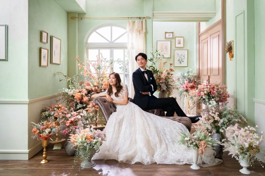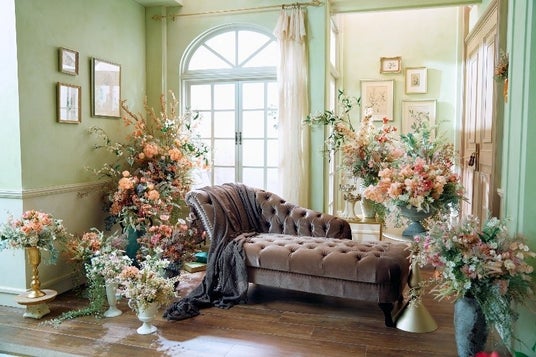 柔らかい光と優しい色の花々に囲まれた唯一無二の空間。ヨーロッパの邸宅を思わせる優雅なセット。