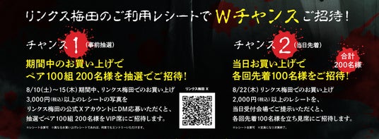 8/10(土)〜15(木)期間中、リンクス梅田でのお買い上げ3,000円(税込)以上のレシートの写真を、リンクス梅田の公式XアカウントにDM応募いただくと、抽選でペア100組200名様をVIP席にご招待します。
