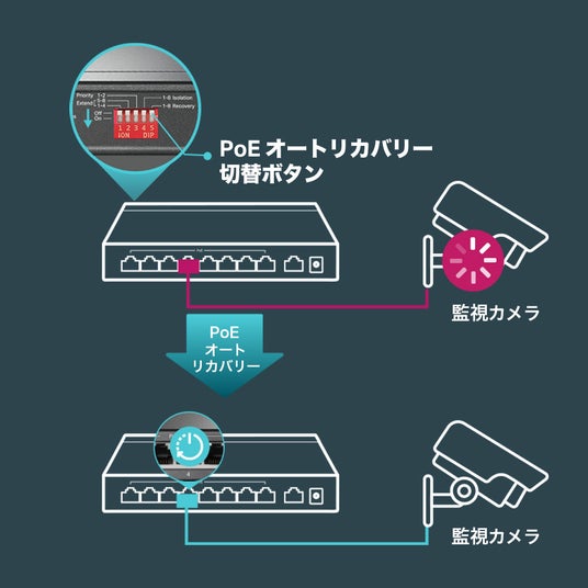 フリーズして応答しなくなったカメラやAPを、スイッチが自動的に検知して再起動させます。手動でデバイス監視・再起動をする手間が削減され、PoEデバイスの安定した動作が保証されます。